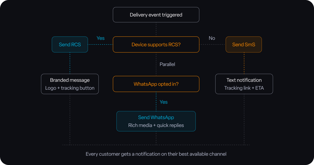 An intelligent messaging system sends an RCS notification first. If the device doesn’t support RCS, it falls back to SMS. If the customer has opted into WhatsApp Business messages, a parallel notification goes there too. The result: total reachability, regardless of device, network, or customer preference.