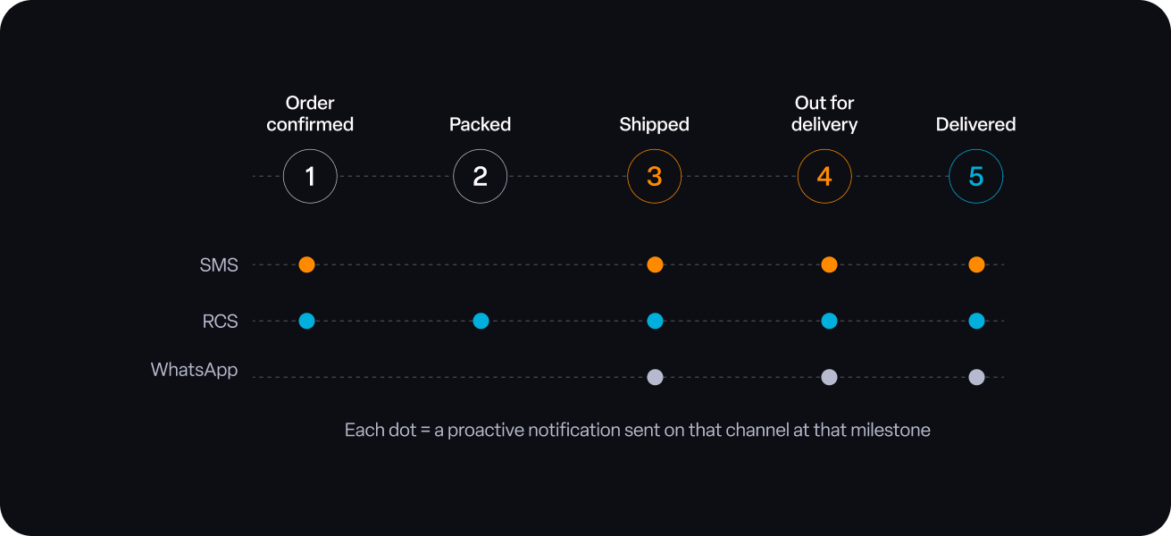 The messaging costs themselves are a fraction of the savings. A well-orchestrated SMS + RCS + WhatsApp notification flow costs pennies per order. The return is measured in dollars.